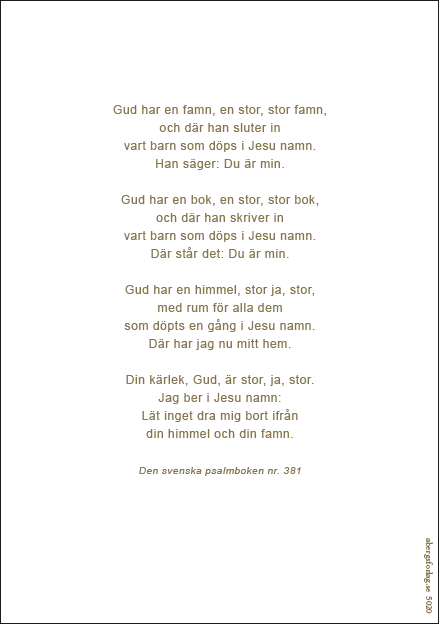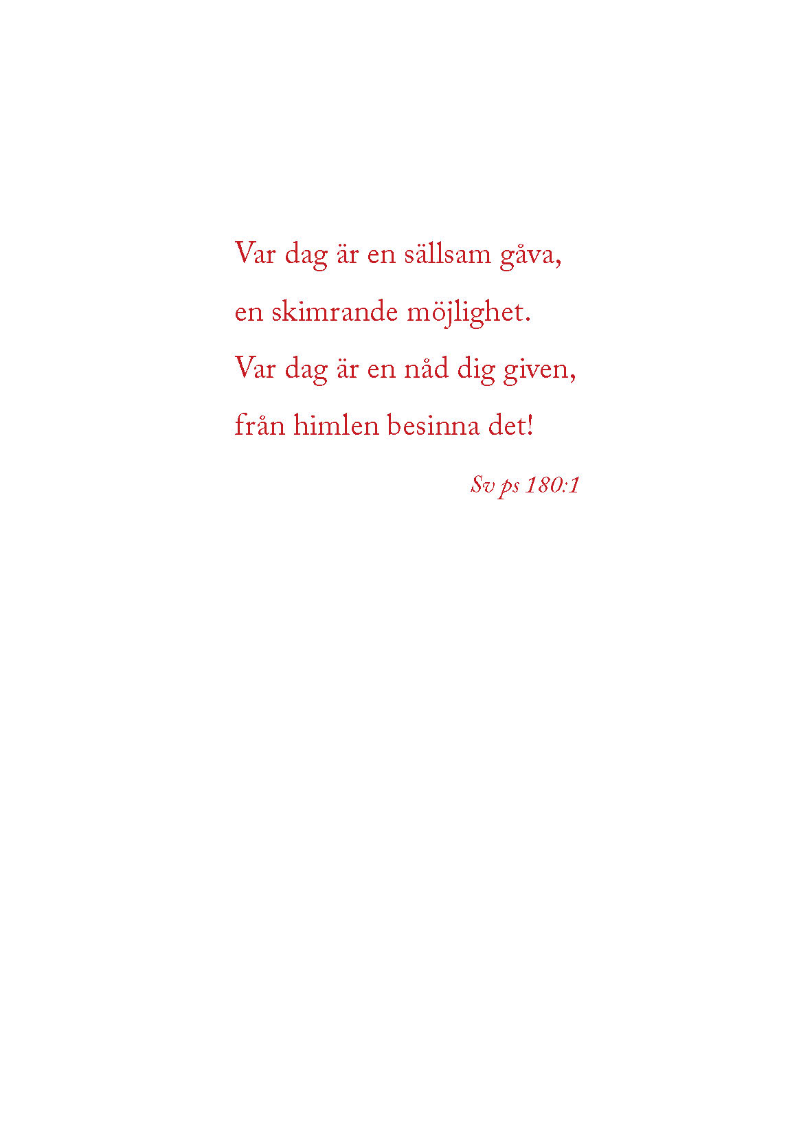Ett vackert gratulationskort speciellt framtaget till församlingen. Mycket uppskattat gratulationskort på elegant papper som omfattar 4 sidor med förtryckta tunna linjer på sidan tre för att fylla i för hand. Innehåller text ur Sv ps 180:1 ”Var dag är en sällsam gåva, en skimrande möjlighet. Var dag är en nåd dig given, från himlen besinna det!”. Formaten är stående A5, färg.